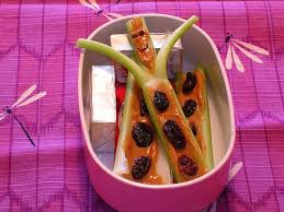 This is a fun snack that kids can make. It consists of artfully arranged celery, peanut butter, and raisins."