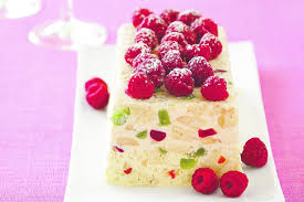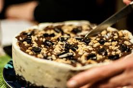 4- Freeze the cake until firm, ideally overnight, but at least 2 hours.When ready to serve, lift it out of the pan using the parchment paper handles and transfer it to a large plate.